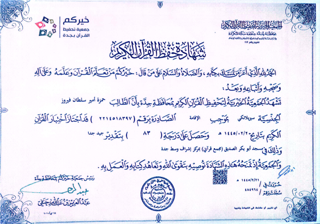Successfully completed the memorization of all 30 Juz' and passed the final examination.